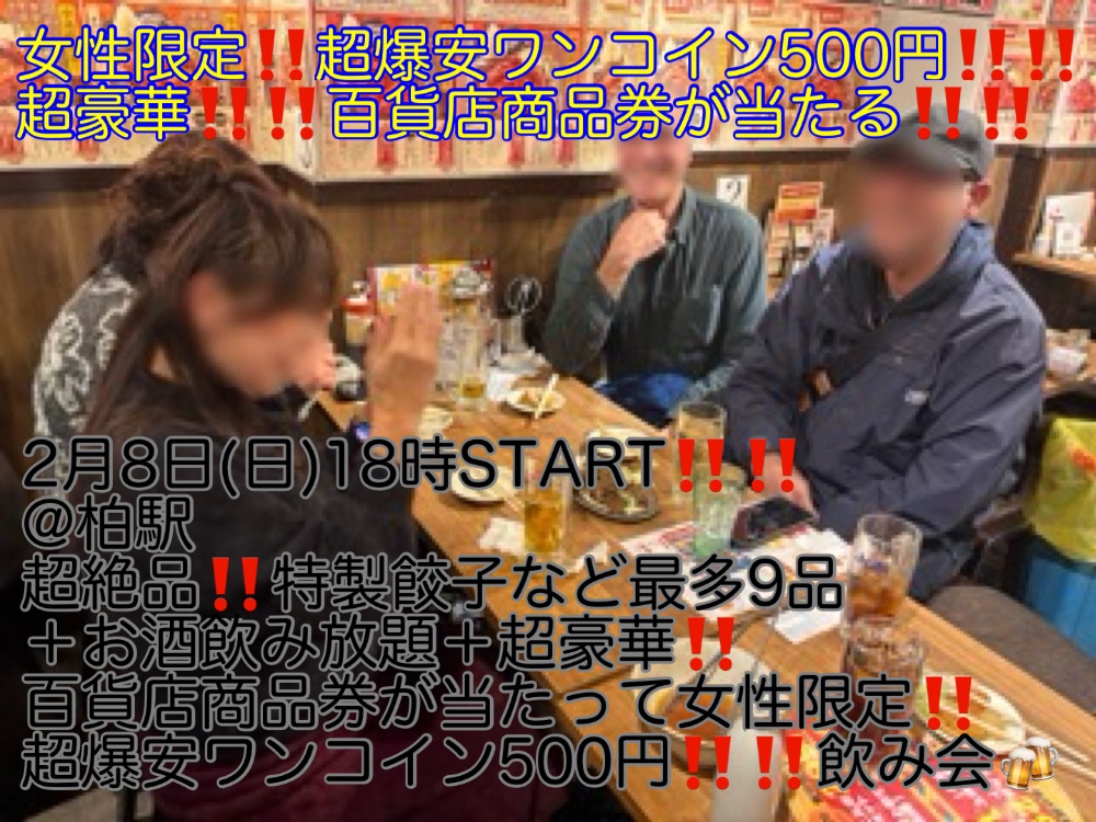 | 【千葉】 2月8日(日)18時〜柏駅 | 超絶品!!特製餃子など9品+お酒飲み放題+超豪華!!百貨店商品券が当たって超爆安ワンコイン500円飲み会🍻 https://jmty.jp/s/chiba/eve-par/article-1mnrgc 女性: 500円 男性: 6,200円 ※男性はLINE登録で、500円OFF!! |