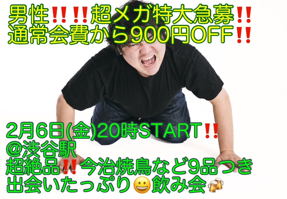 | 【東京】2月6日(金)20時〜渋谷駅 | 超絶品!!今治焼鳥など9品+お酒飲み放題つきで超爆安!!900円!!飲み会🍻 https://jmty.jp/s/tokyo/eve-par/article-1mnr0g 女性: 900円 男性: 5,500円 ※男性はLINE登録で、500円OFF!! |